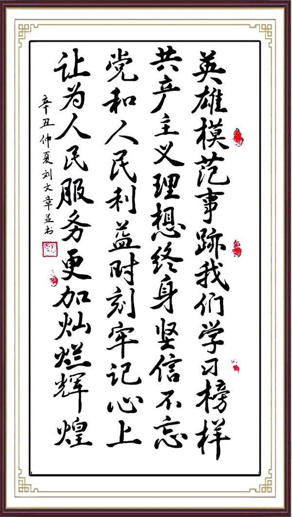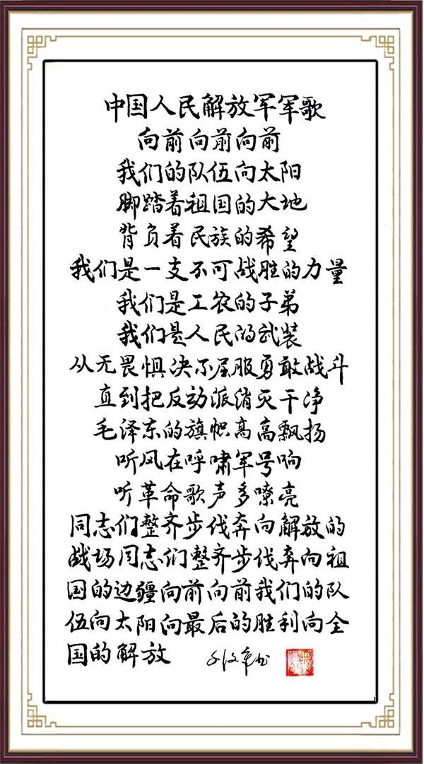 连续三年忆写书圣王羲之《兰亭序》800余篇,深得书聖造旨精华,写出《论书法美在形神味》论文,被中国书画报刊载,在炎黄艺术杯中华全国书画艺术大赛中\,获终身成就奖。行楷书《建设文化强国》,《巨龙腾飞》等书法作品,被中国邮政制成十大文化名家邮票发行。草书《龙虎》两字被中国军事博物馆收藏,行楷书《两岸一家亲》被马英九先生收藏,隶书《但愿此生长报国》,被刻在巨型石书页上,安放在长征出发地,行书《书写新时代,描绘中国梦》,被刻在带有红色国徽的新疆和田玉盘上,作为国礼赠送给一带一路国家元首。