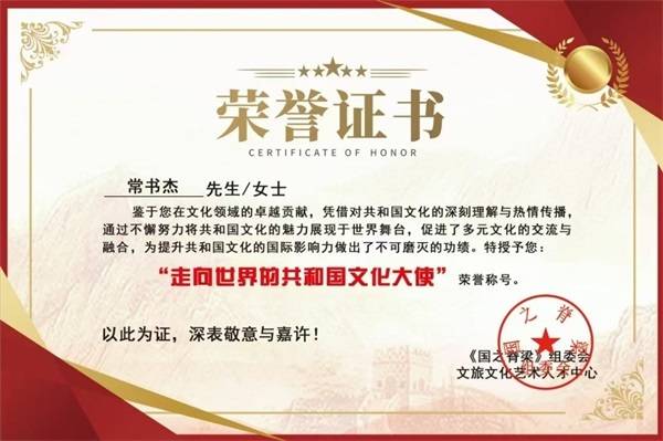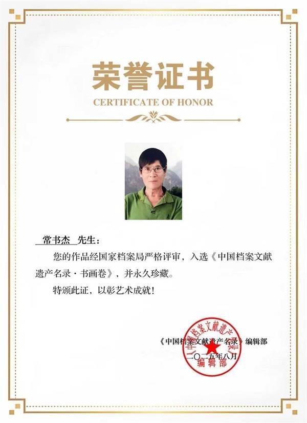 2023年入编CCTV华夏之声《中国艺术传承大家常书杰专题报道》。2023年入编企业日报社《全国国际国礼形象大使》常书杰。2023年入编以文化自信推进中华软实力全国国际国礼形象大使著名艺术家常书杰入驻迪拜国际拍卖平台。2023年入编中国投资界新机遇新价值鼎力推荐艺术大师常书杰作品展示。