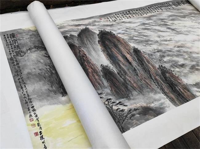 锁平先生创作山水,像写书法一样深深因循山水里的文化龙脉,带着为天地张目的精气神对境造意,也是通过山水创作独与天地精神往来的丹青贤家!他作山水,深谙六法之论,完全是一派笔墨精彩的孤标尘外!请看《盤江印象图》这一件惟妙的山水佳作,执笔作线,骨法峥嵘,勾下一笔滑畅劲健,复作勒笔钢打铁铸。这正是骨法用笔的精湛,把中国画依线条造型的本质表现得无以复加!无有一根线条凌乱,不让一笔失控而成为散兵游勇!又有诸多皴法的灵活调度,可以让笔法呈现千变万化,斧劈皴雄奇,折带皴错落,雨点皴空蒙,披麻皴生机。好的笔法就是其山水作品专业品质高能,让人无可挑剔的重要原因。