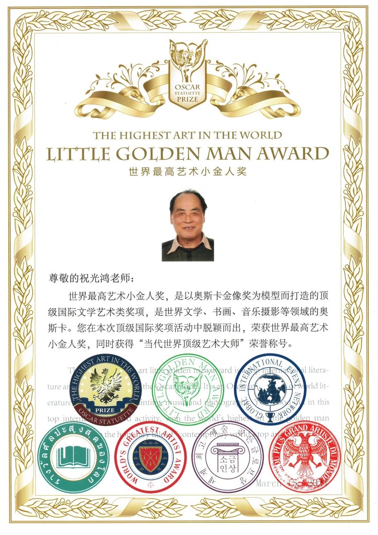 2021年12月荣获“世界最高艺术小金人奖”,并被授予“当代世界顶级艺术大师”称号,由意大利、韩国、中国等八个国家联合颁发。