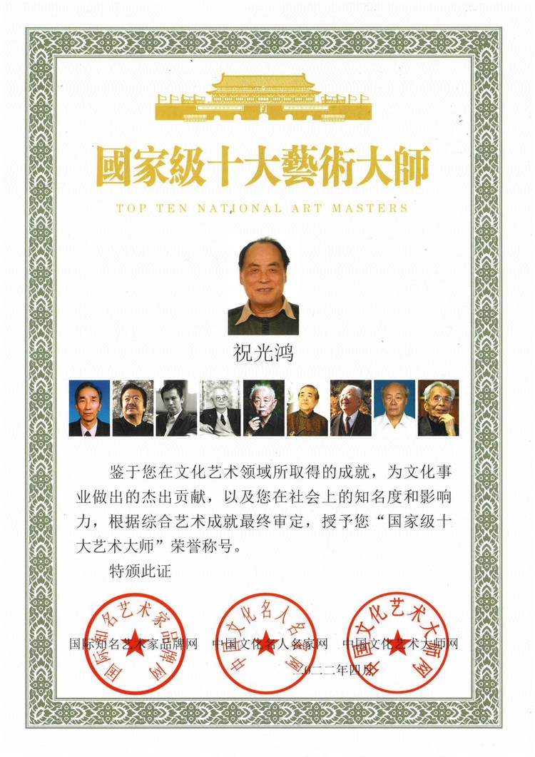 2022年6月20日荣获“一带一路·全球世博文化互艺奖”,并授予“一带一路·全球巡展国宝级艺术大师”荣誉称号,颁发“一带一路·全球艺术巡展大使”勋章,获得“一带一路·祝光鸿国际和平艺术馆”建馆资格,由一带一路文化发展协会、中国世博文化发展协会和世界环球艺术网联合颁发。