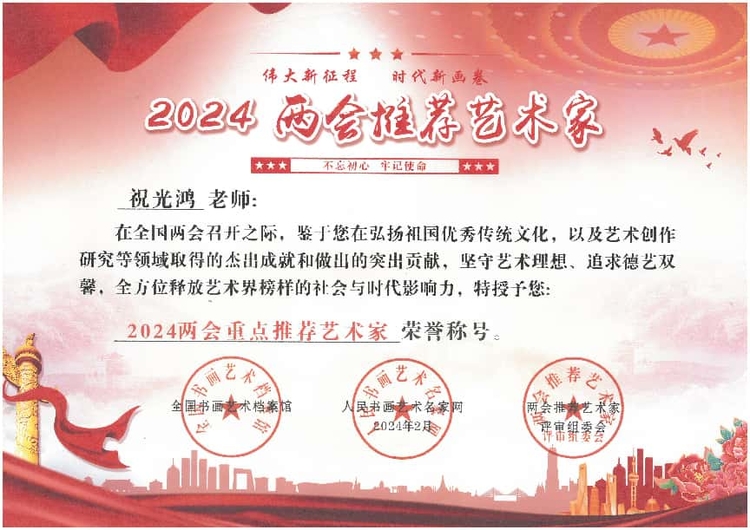 2024年2月荣获2024两会重点推荐艺术家荣誉称号,由人民书画艺术家名家网和两会推荐艺术家评审组委会联合颁发。