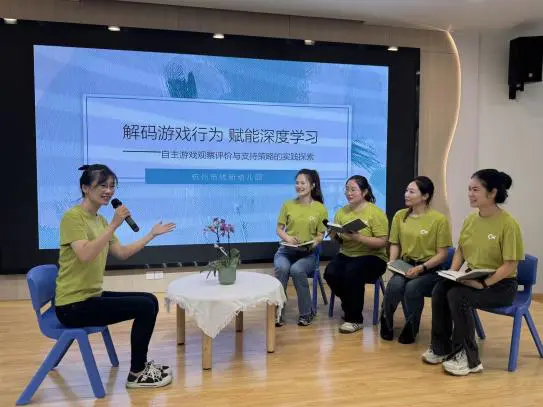 真正的成长源于反思与共研。在观摩幼儿自主游戏后,方咪副园长分享了我园《提升教师观察评价能力的项目实践》。钱新幼教研组更以一场生动的“圆桌教研”现场,展示了如何从“卷入度”视角出发,运用可视化工具深度解析幼儿游戏行为。这种基于真实问题、团队共研的研修机制,为跟岗教师提供了可迁移的教研范式,双方在思维碰撞中共同探寻教师专业成长的可持续路径。