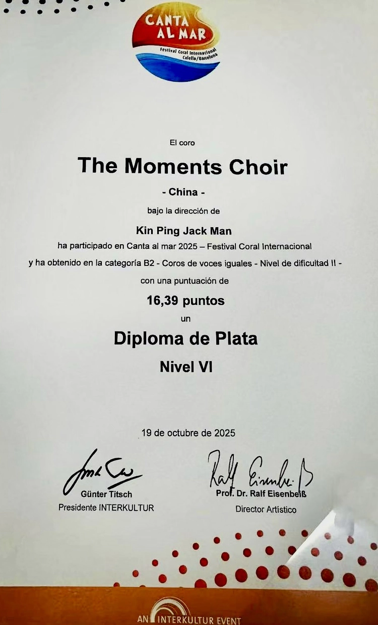 2025年10月19日,第十一届卡莱利亚国际合唱比赛暨音乐节在西班牙圆满落幕。本届赛事云集全球22个国家的35支顶尖合唱团,上演了精彩纷呈的音乐盛宴并促进了国际文化交流。上海戏剧学院继续教育学院初见合唱团在本届强手如林的赛事中脱颖而出,凭借精湛的演唱技艺与独树一帜的艺术表现力,最终于竞争激烈的B组别-同声合唱(二级难度)比赛中摘得银奖,为学院与中国合唱艺术赢得国际荣誉。
