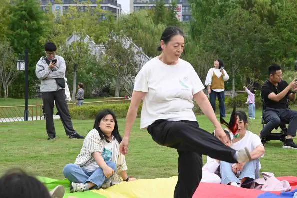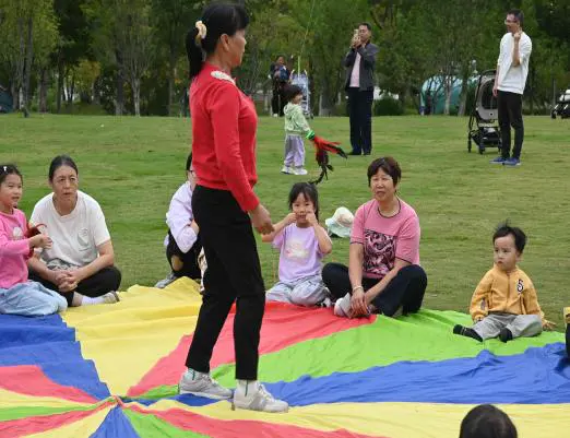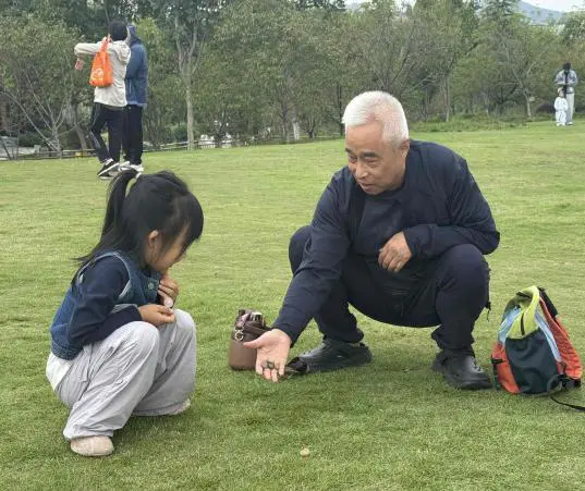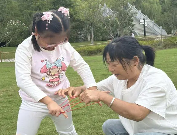 草坪变成了“重温童年游戏场”,丢手绢、翻花绳、丢石子、打四角包、抬轿子……这些承载着祖辈童年记忆的经典游戏,在祖孙携手合作中重新焕发生机。爷爷奶奶手把手教孩子翻出多样的绳结,孩子们拉着爷爷奶奶奔跑着追逐丢手绢的小伙伴,大家蹲在地上玩石子时的笑声、抬轿子时的欢呼声此起彼伏。祖辈的童年记忆与孙辈的活力身影在此碰撞,每一个瞬间都满是温暖的火花。