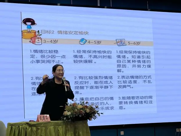 武教授站在不同的角度,和家长们分享了如何有效管理自己的情绪。她结合《3-6岁儿童学习与发展指南》的健康领域目标,通过对照小、中、大班不同年龄段的发展目标,详细讲述了幼儿情绪发展的特点。
