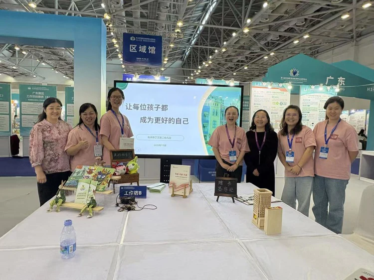作为2025年浙江省基础教育教学成果一等奖,杭州市丁兰第二幼儿园受邀参展。在教博会现场,采用图文、视频播放相结合的方式,全方位展现幼儿园“深融模式”教育品牌。