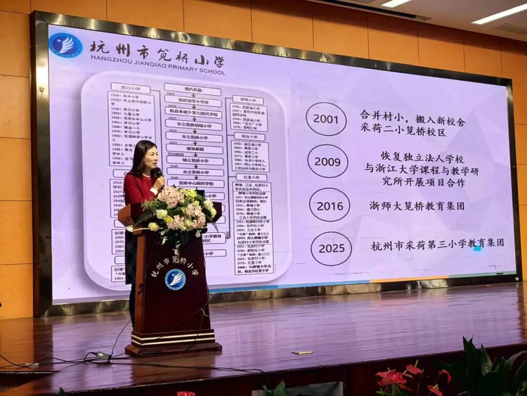 参观结束后,双方在报告厅开展专题交流。张校首先介绍了笕桥小学的办学理念、发展历程与整体办学特色,从学校顶层设计到实践落地进行全景式阐述,为后续研讨奠定基础。