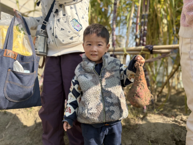 在红薯地里,孩子们手握小铲,蹲下身来,学着爸爸妈妈的样子用小铲子从泥土边缘斜斜插入,脚踩铲背,用力一蹬——“噗”一声,泥土松动了!再用手轻轻扒开,圆滚滚的红薯就露出了小脑袋。孩子们兴奋地叫起来:“我挖到啦!”家长们也蹲下来,一起用手拨开周围的泥土,小心翼翼地把整颗红薯取出。随后,亲子配合,将挖出的红薯轻轻扫去泥土,装进竹篮中。孩子们紧紧抱着自己亲手收获的果实,脸上洋溢着满满的成就感与喜悦。
