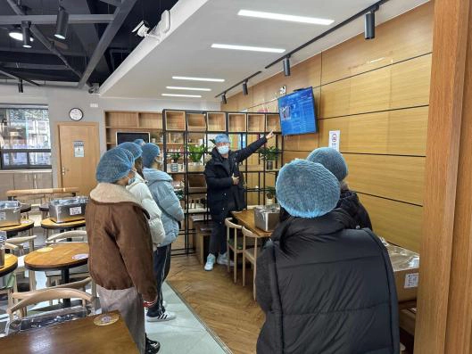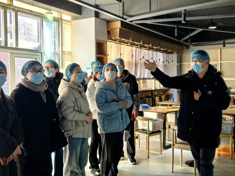 上午十点,七位家长在老师的引导下,佩戴好口罩与帽子,有序走进食堂后厨。他们实地查看了食品储存、清洗切配、烹饪加工、餐具消毒等各个功能区域,详细了解“明厨亮灶”运作机制,并对食堂员工规范、卫生的操作流程与整洁有序的环境留下了深刻印象。参观期间,食堂还特意调整了部分工作节奏,确保家长观察得更清晰、更全面。