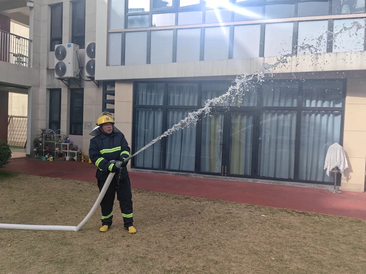 消防服穿戴就绪,水带连接及灭火实操紧接着登场!保安师傅迅速拎起消防水带与水枪,动作麻利地将水带一端精准对接消防栓接口,同步发力展开、铺直水带。找准模拟火点后,他们稳稳握住水枪对准目标,随即开启消防栓阀门,水流“唰”地喷涌而出,精准直击火点根部,直到火焰彻底熄灭。之后迅速关闭阀门、整理好器材,抬手示意完成操作。