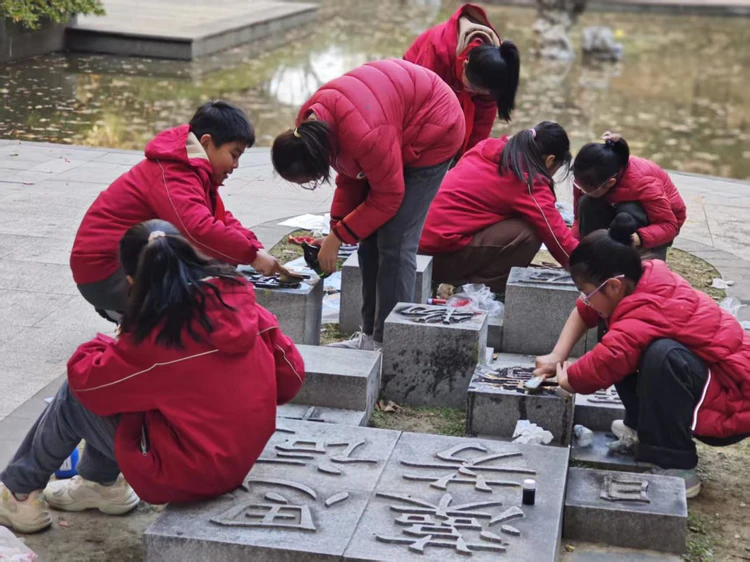 “蓝泡泡艺术创想周”现场赛则更具互动温度:孩子们编织《树的新衣》,为校园大树披上祝福;创作《童绘千面,镜见文澜》,让观众在镜中与校园同框。全校书画征集收到120余件作品,30幅优秀之作入选展览。剪纸红火、国画雅致、书法遒劲、儿童画烂漫——每一笔,都是学子写给母校的情书。