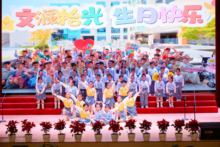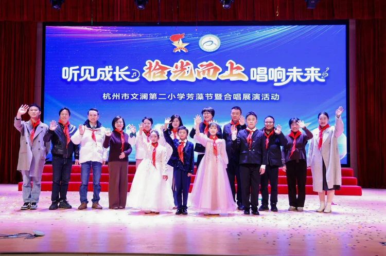 如果校史馆是静默的生长,那么庆典舞台就是奔腾的绽放。校庆典礼在“澜星之舞”《快乐向未来》中欢腾启幕,吉祥物“澜宝”首次登台,与全场师生共呼“小水滴,大力量”,童声如潮,热情似火。舞台之上,每一个节目都是一段教育的叙事:教师朗诵+歌曲《文澜赠予我的》,深情的告白诠释了何为“三尺讲台存日月”;《中华小戏迷》《红色浪漫》,戏曲音韵流转间,是文化自信的悄然生根;口风琴《拉德兹基进行曲》、民乐《权御天下》,琴声激荡,展现艺术素养的扎实积淀;班级合唱《如愿》《远航》,毕业学子与在校生以歌寄情,既有感恩,也有憧憬。典礼最终在全校师生合唱校歌《文澜有光》中推向高潮——“有一种光芒,叫做希望”。这光芒,属于舞台,更属于每一个正在生长的文澜人。