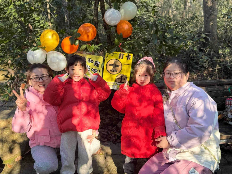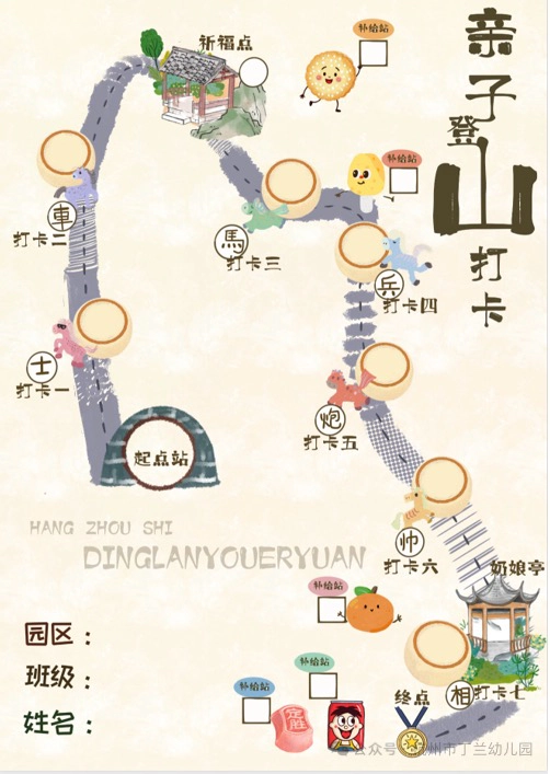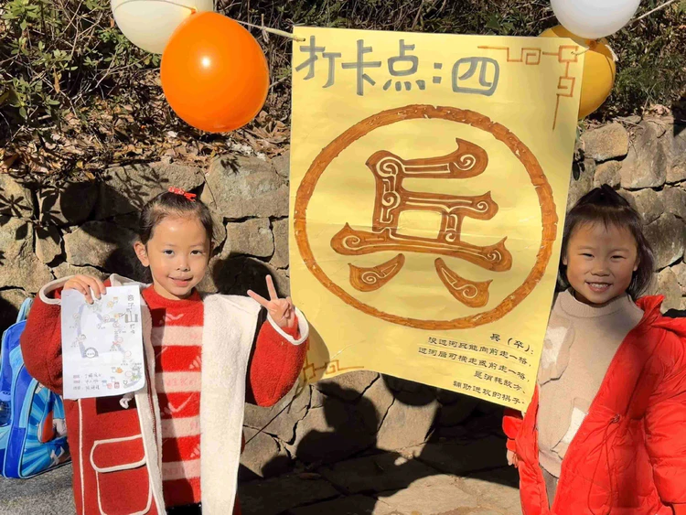 中大班专场则以“棋开得胜”为核心,开启了一场象棋文化与体能挑战深度融合的登山闯关。孩子们从吴越松径或杨梅老林出发,途经多个打卡点,最终抵达终点。