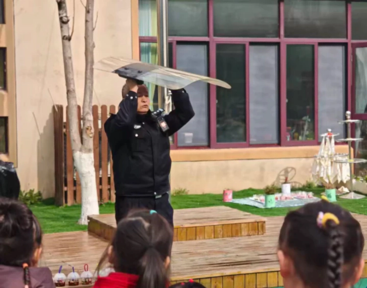 演练结束后,辖区民警走进幼儿中间,通过情景互动、器械展示,讲解防暴钢叉等装备的用途;各班教师引导幼儿辨识防暴警报的独特声音,区分消防、防灾等不同警报,在孩子心中筑牢清晰的安全认知防线。