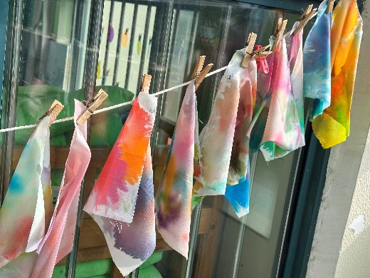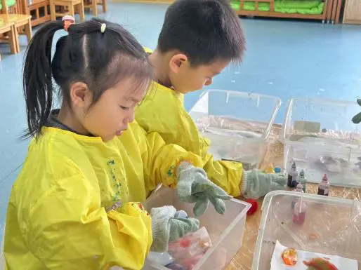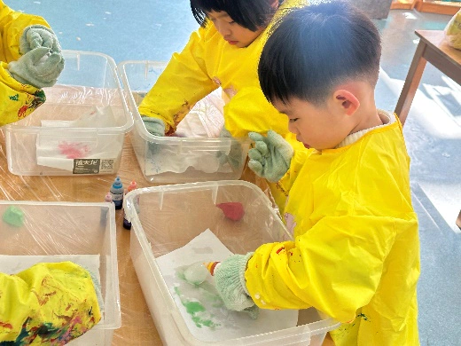 意外的发现,让探索之旅再度升级。不久后,孩子们观察到树枝上的彩色冰块在阳光下逐渐融化,彩色水滴落在草地上,晕染出别样色彩。这一现象引发了新的思考:“我们能不能让更多东西染上彩色呀?”由此,创意冰染游戏正式上线。教师与孩子们共同准备了彩色冰块、透明冰块、色素、白色棉布等材料,通过观看创意视频了解冰染技巧后,孩子们戴上小手套动手实践。有的让带颜料的冰块在白布上自然融化晕色,有的在透明冰块上滴加色素后滚动,让冰块在布面上“留下”彩色轨迹,每一块白布都变成了独一无二的艺术作品,孩子们在惊呼中感受着冰与色彩交融的奇妙。