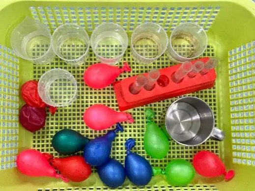 在实践环节,孩子们化身“小小魔法师”,分组解锁彩色冰块的多种制作方法。有的小组在水中滴入颜料冷冻成型,有的直接在冰块上涂染色彩,还有的将冰块放入颜料桶浸泡染色,在教师的协助下,各组均成功收获了彩色冰块。不甘于单一形状的孩子们还发起“形状大挑战”,利用宽口杯、牛奶杯、气球等不同容器,冻出圆柱体、上宽下窄、圆球状等形态各异的冰块,每一块都凝聚着孩子们的巧思。创意不止于此,在教师的追问下,孩子们又尝试将彩色积木、小毛球、彩纸碎等小物件融入冰块冷冻,让透明冰面下藏满了彩色小秘密。