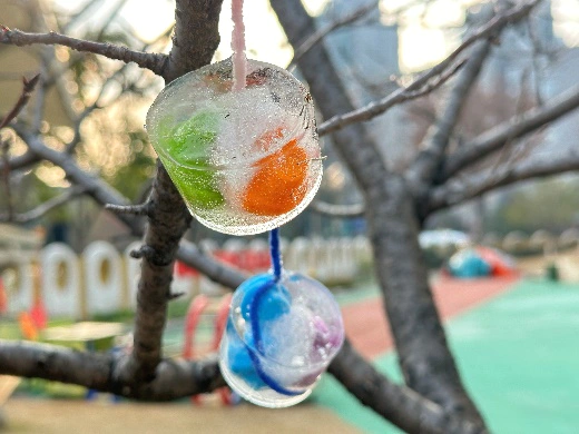 冬日的户外,成为了孩子们展示成果的舞台。清晨,小朋友们小心翼翼地提着亲手制作的彩色冰块,将其串成串悬挂在园区树枝上。阳光洒落时,彩色冰块折射出斑斓光影,微风拂过便轻轻晃动,宛如一串串会发光的彩色风铃,为冬日的幼儿园增添了灵动生机,成为园区里一道独特的风景线。