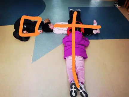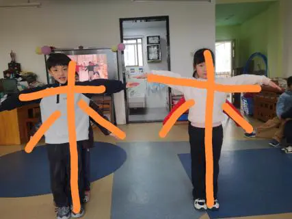 2.身体绘姓·身体比姓:“看!4个小朋友可以拼成一个‘林’字”……