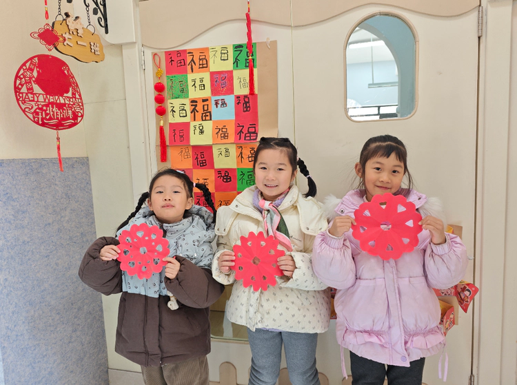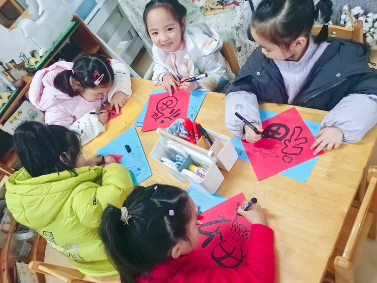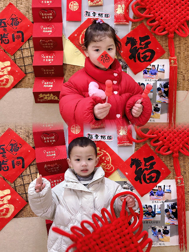 大班宝贝聚焦“冬天的祝福”,解读《元日》、分享家中年味,动手制作创意福字,用画笔寄托对新年的美好祝愿。