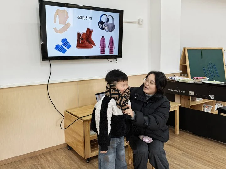 “冬天可以使用的‘宝贝’是什么呢?”围绕这个话题,教师结合PPT展示与实物观察,引导幼儿进一步认识各类保暖物品,手把手教他们正确使用方法,帮助幼儿提升自我保暖的基本技能。