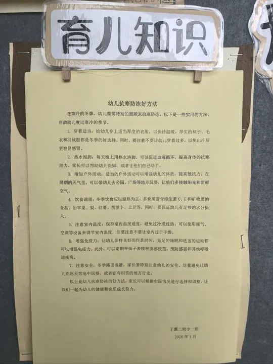 为切实加强幼儿冬季安全防护意识,提升应对寒冷天气的自我保护能力,杭州市丁蕙第二幼儿园开展以“暖护童心,安全防寒”为主题的防寒保暖安全月系列活动。通过宣传、教育、实践等多个维度,将防寒保暖安全教育融入幼儿一日生活,为全园幼儿筑起一道坚实的冬季温暖安全防线。