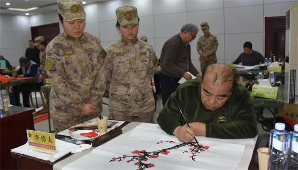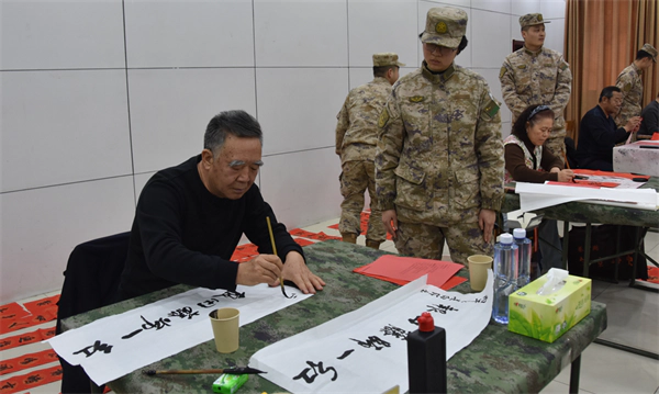 墨起纸舒,情寄笔端。书画家们凝神挥毫,红纸铺展间,笔锋流转藏赤诚,浓墨重彩寄祝福。官兵们围拢身旁,或求“打胜打赢”的强军寄语,或索“官兵情深”的暖心墨宝,或祈“福寿康宁”的新春祝愿,每一副春联、每一个“福”字,都凝着国粹之美,藏着军民同心的温情。寒风吹不散现场暖意,墨香融得进鱼水深情,书画家们满含热忱,一一满足官兵所求,迟迟不愿收笔,用笔墨勾勒出军民一家亲的温馨画卷。