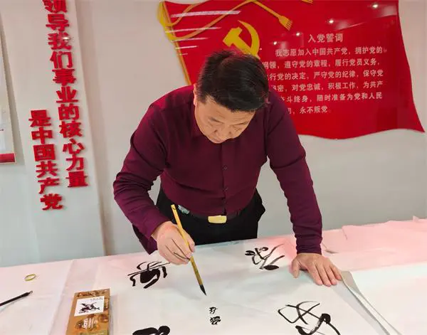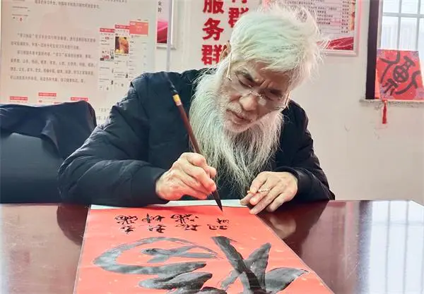 书画创作活动现场气氛热烈、墨香四溢,书画家们挥毫拨墨,将美好祝愿化作一副副寓意吉祥的春联和一张张气韵生动的“福”字,传递到村民手中。