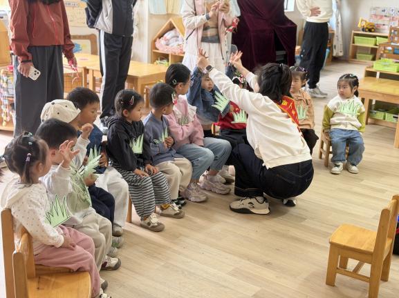 蓝萌萌班的音乐活动《小草醒来了》将春日元素与音乐律动完美结合,教师带领孩子们扮演沉睡的小草,随着音乐的变化,模仿小草慢慢醒来、慢慢长大的姿态。孩子们手持纱巾,跟着舒缓的音乐舒展身体,在自主想象和自由表现中,感知音乐的魅力,体验在音乐中嬉戏的乐趣,也感受到了春天万物复苏的生机。